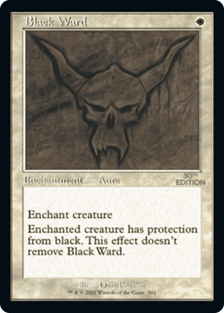 Enchant creature Enchanted creature has protection from black. This effect doesn’t remove this Aura.