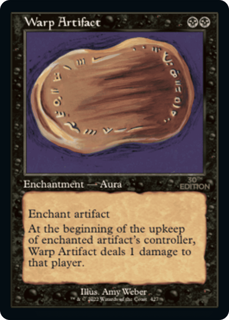 Enchant artifact At the beginning of the upkeep of enchanted artifact’s controller, this Aura deals 1 damage to that player.