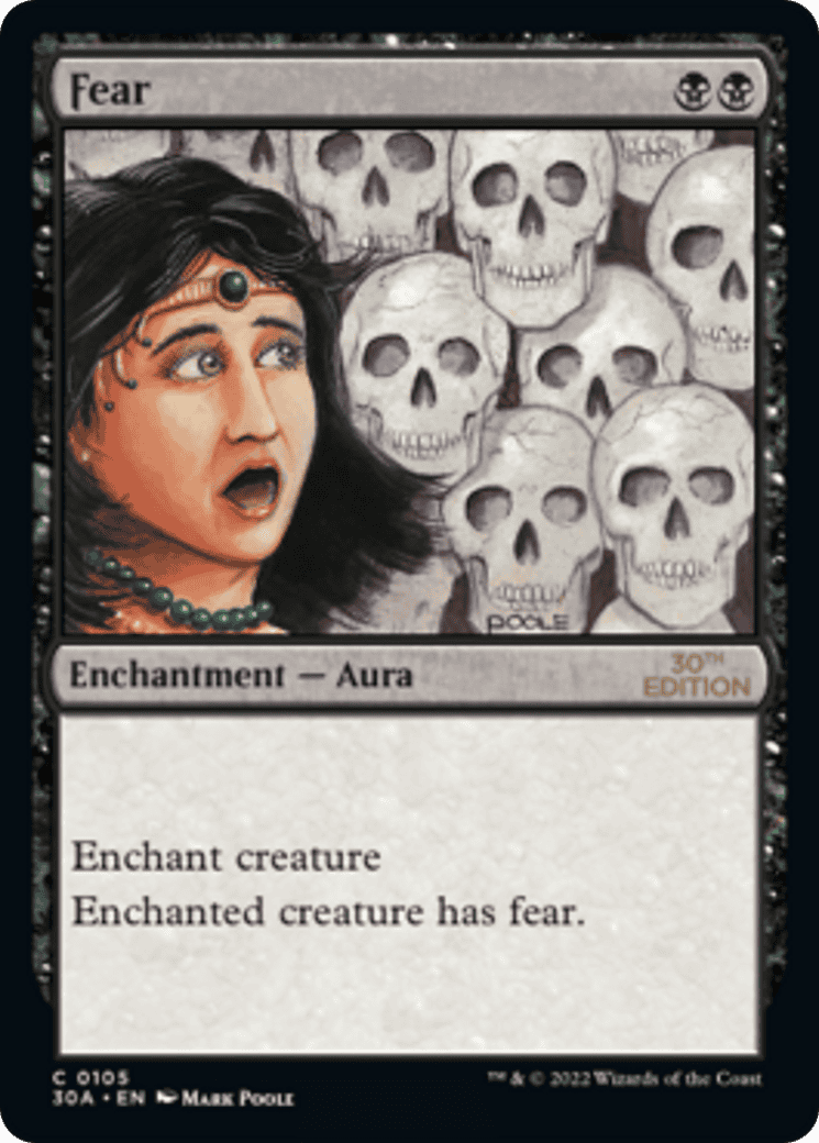 Enchanted creature has fear. (It can’t be blocked except by artifact creatures and/or black creatures.)