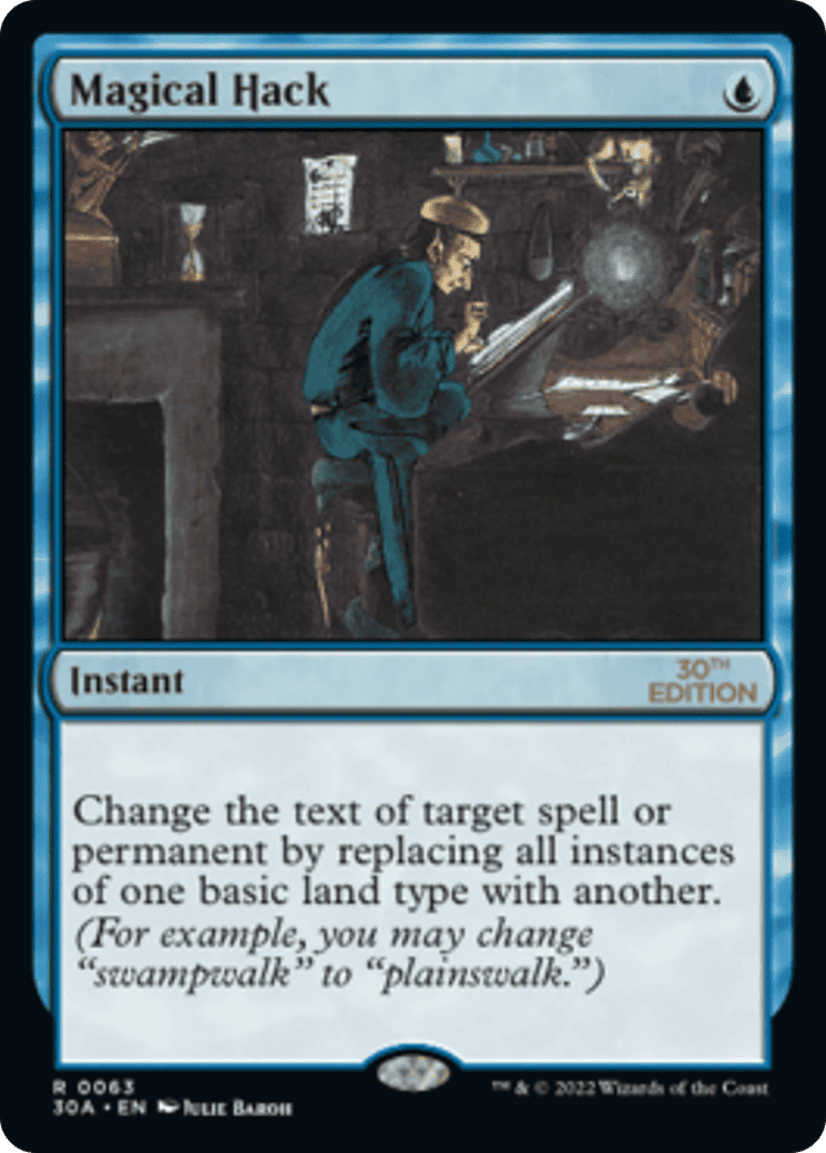 Change the text of target spell or permanent by replacing all instances of one basic land type with another. (For example, you may change “swampwalk” to “plainswalk.” This effect lasts indefinitely.)