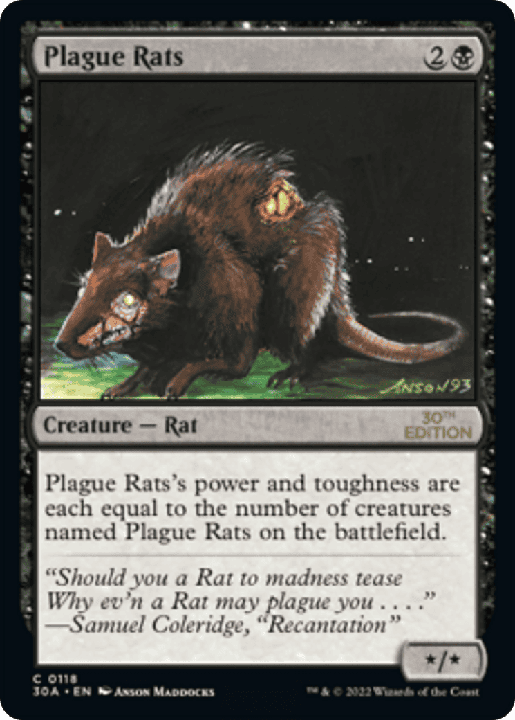 Plague Rats’s power and toughness are each equal to the number of creatures named Plague Rats on the battlefield.