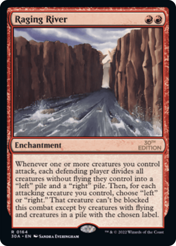Whenever one or more creatures you control attack, each defending player divides all creatures without flying they control into a “left” pile and a “right” pile. Then, for each attacking creature you control, choose “left” or “right.” That creature can’t