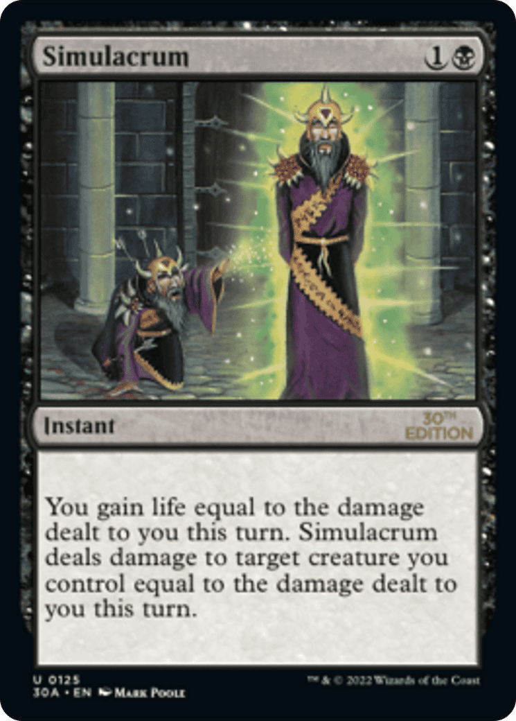 You gain life equal to the damage dealt to you this turn. Simulacrum deals damage to target creature you control equal to the damage dealt to you this turn.