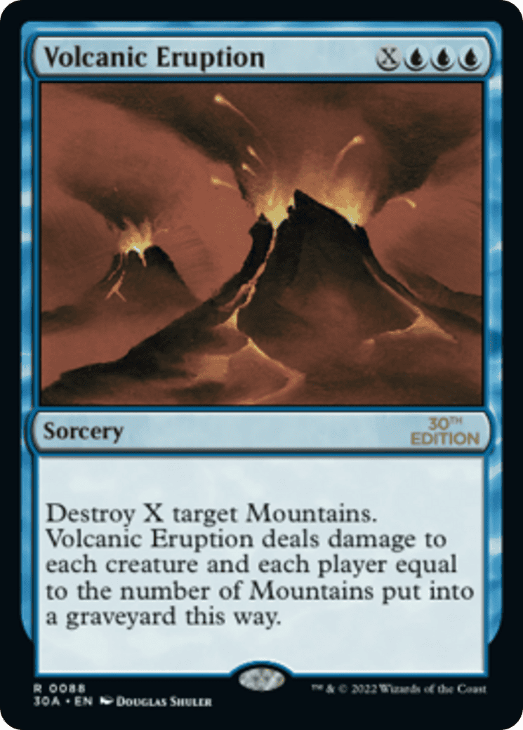 Destroy X target Mountains. Volcanic Eruption deals damage to each creature and each player equal to the number of Mountains put into a graveyard this way.