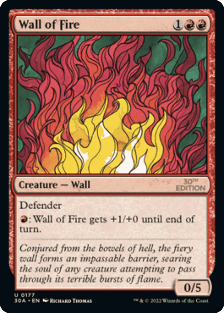 Conjured from the bowels of hell, the fiery wall forms an impassable barrier, searing the soul of any creature attempting to pass through its terrible bursts of flame.