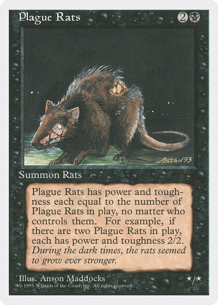 Plague Rats’s power and toughness are each equal to the number of creatures named Plague Rats on the battlefield.