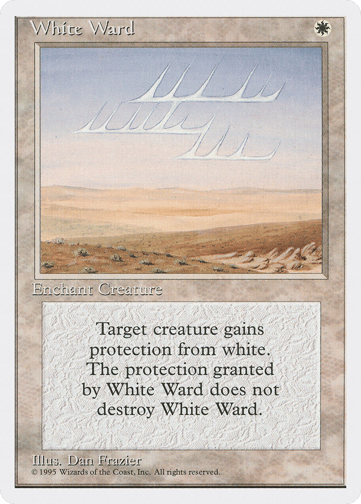 Enchant creature Enchanted creature has protection from white. This effect doesn’t remove this Aura.