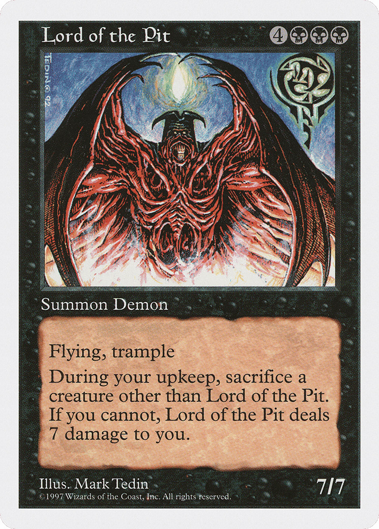 Flying, trample At the beginning of your upkeep, sacrifice a creature other than this creature. If you can’t, this creature deals 7 damage to you.