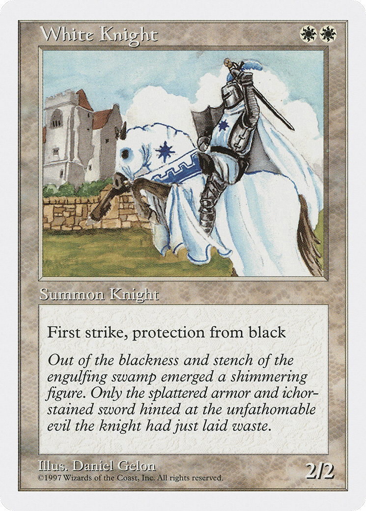 Protection from black (This creature can’t be blocked, targeted, dealt damage, or enchanted by anything black.)