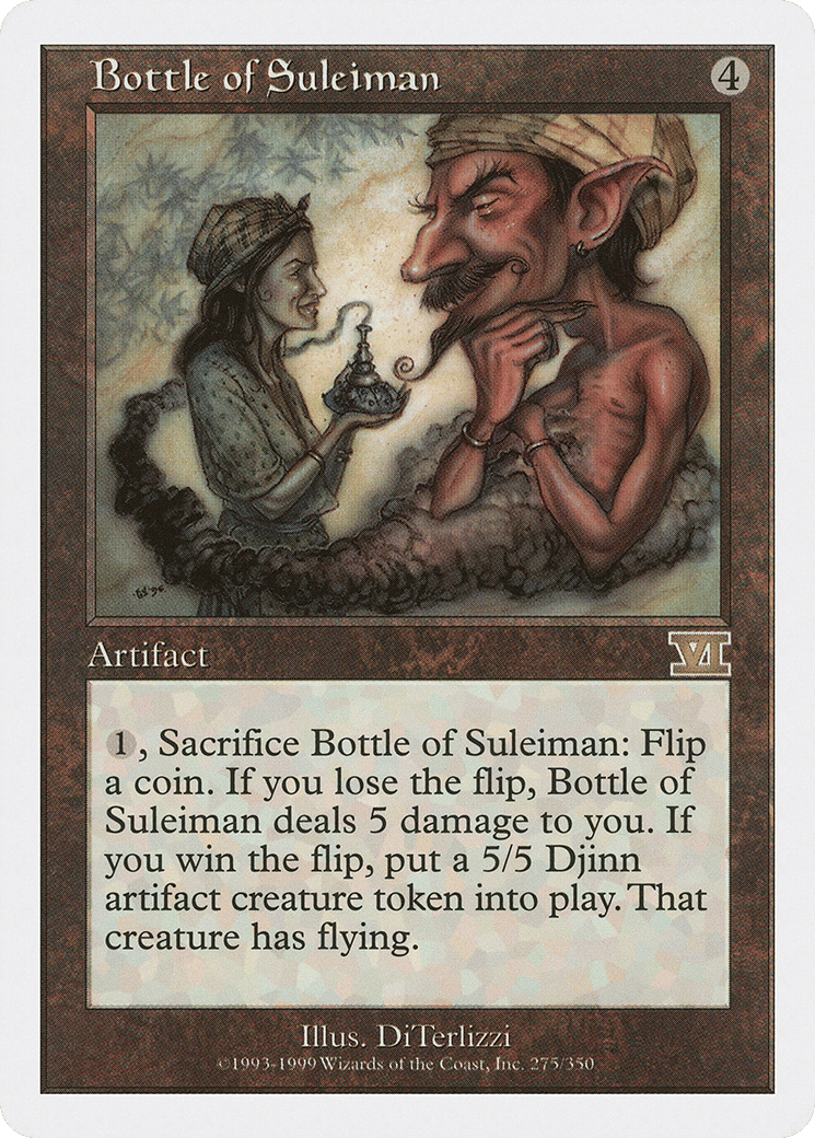 {1}, Sacrifice this artifact: Flip a coin. If you win the flip, create a 5/5 colorless Djinn artifact creature token with flying. If you lose the flip, this artifact deals 5 damage to you.