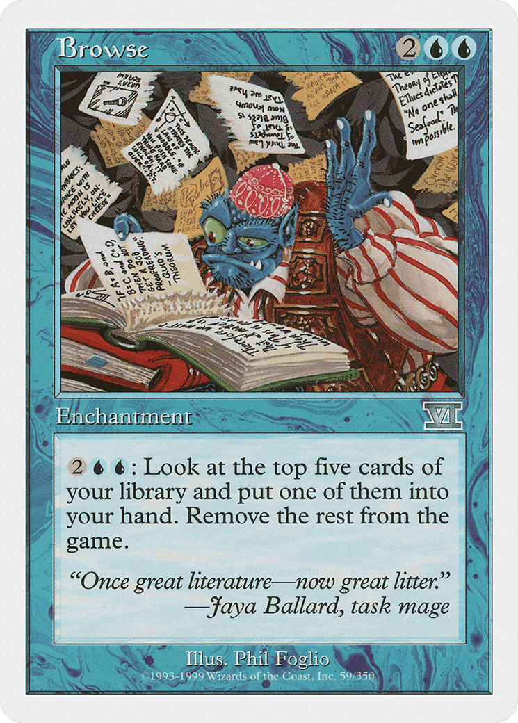 {2}{U}{U}: Look at the top five cards of your library, put one of them into your hand, and exile the rest.