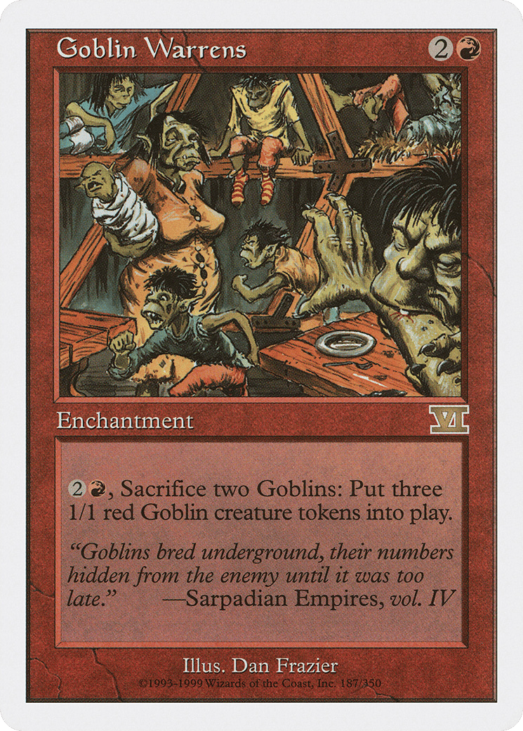 {2}{R}, Sacrifice two Goblins: Create three 1/1 red Goblin creature tokens.