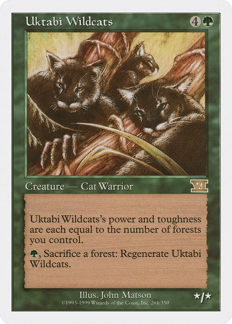 Uktabi Wildcats’s power and toughness are each equal to the number of Forests you control. {G}, Sacrifice a Forest: Regenerate this creature.