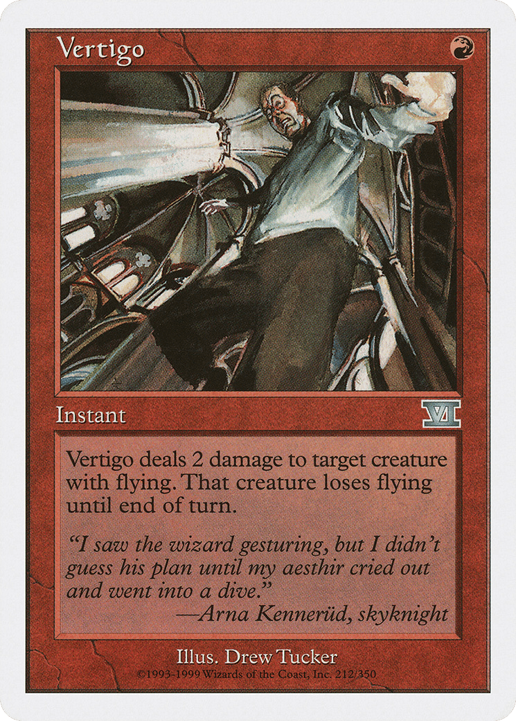 Vertigo deals 2 damage to target creature with flying. That creature loses flying until end of turn.