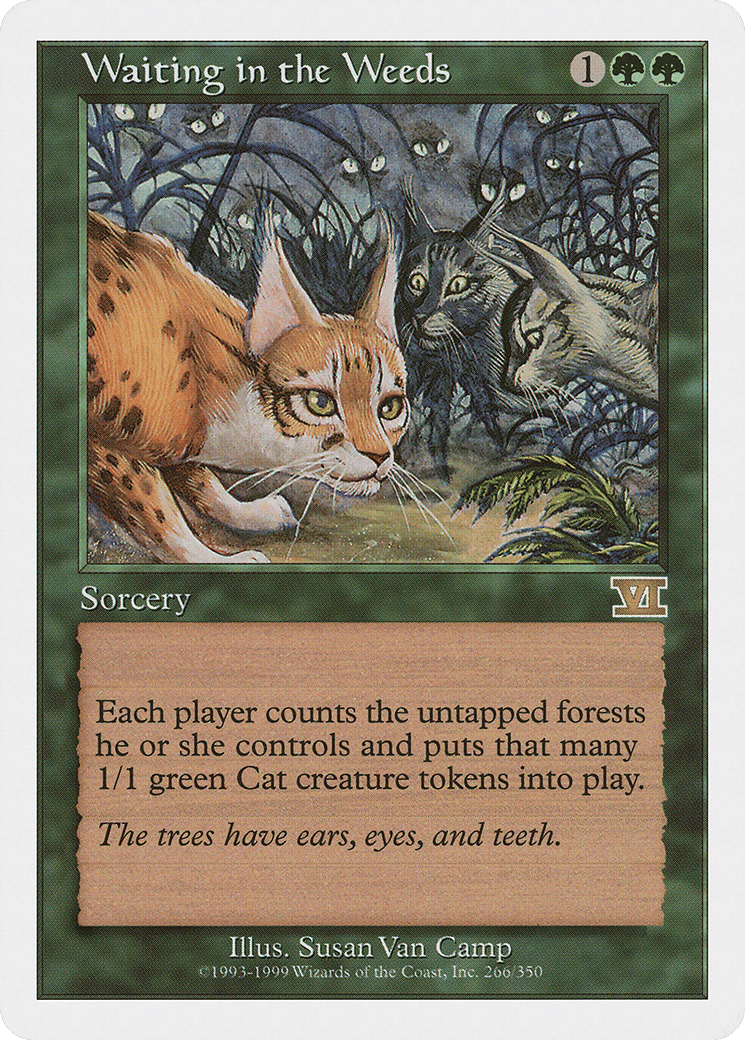Each player creates a 1/1 green Cat creature token for each untapped Forest they control.