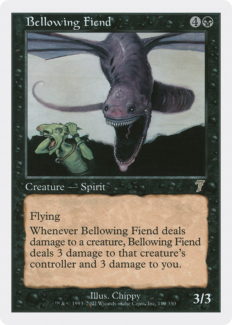 Flying Whenever this creature deals damage to a creature, this creature deals 3 damage to that creature’s controller and 3 damage to you.