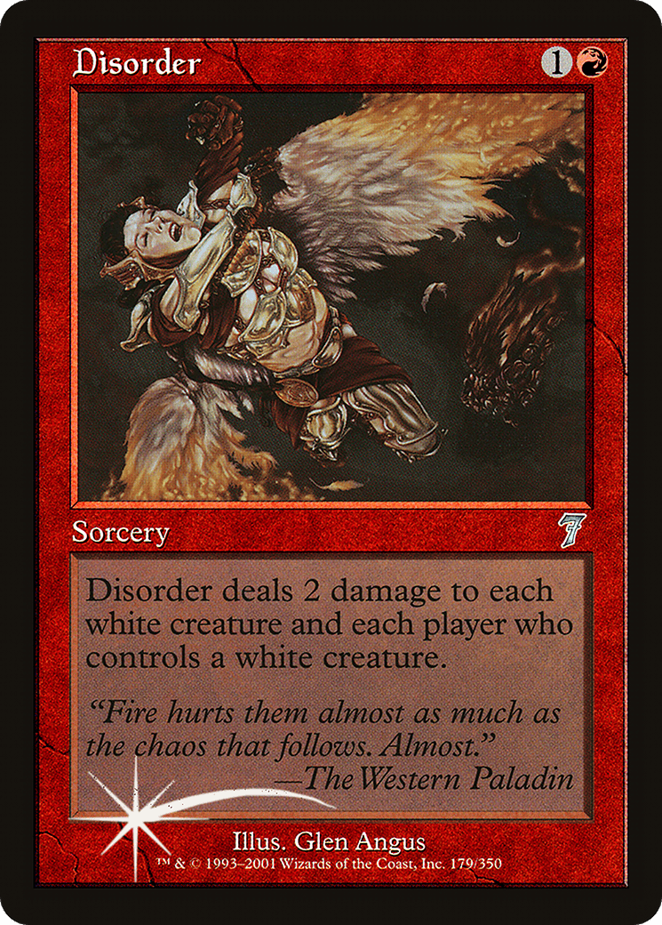 Disorder deals 2 damage to each white creature and each player who controls a white creature.