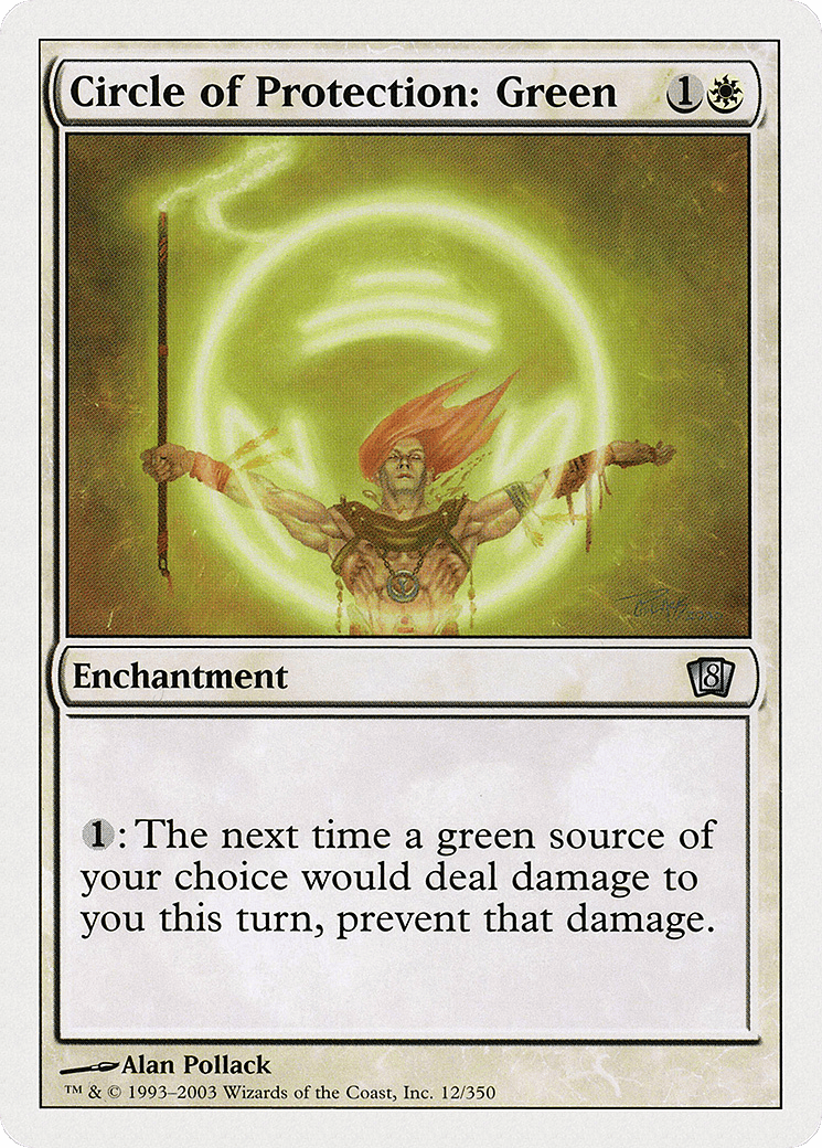 {1}: The next time a green source of your choice would deal damage to you this turn, prevent that damage.