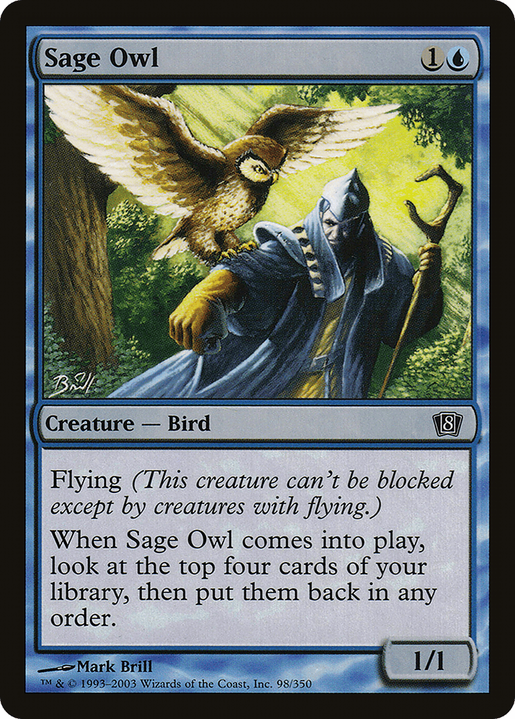 Flying When this creature enters, look at the top four cards of your library, then put them back in any order.