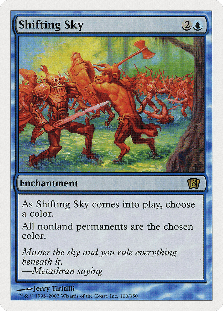 As this enchantment enters, choose a color. All nonland permanents are the chosen color.