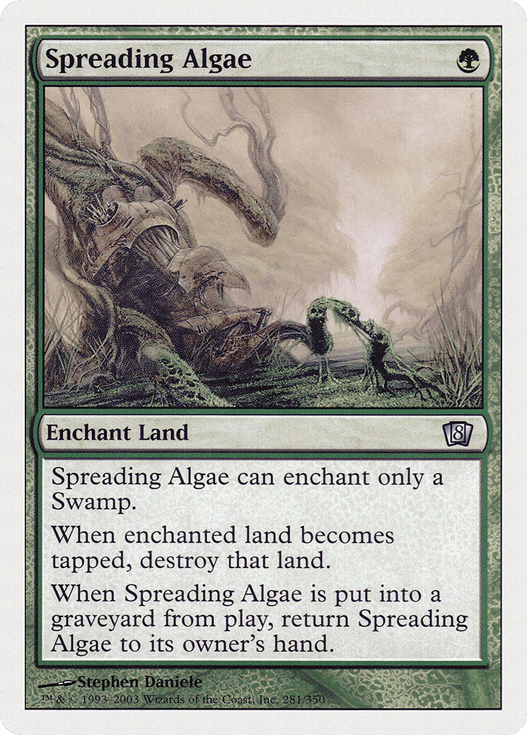 Enchant Swamp When enchanted land becomes tapped, destroy it. When this Aura is put into a graveyard from the battlefield, return it to its owner’s hand.