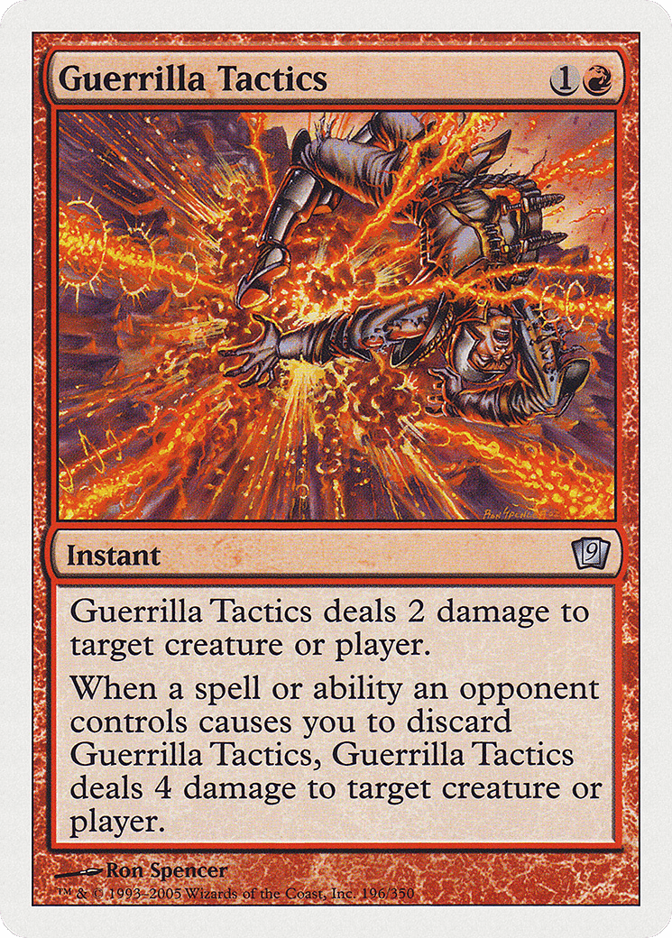 Guerrilla Tactics deals 2 damage to any target. When a spell or ability an opponent controls causes you to discard this card, it deals 4 damage to any target.