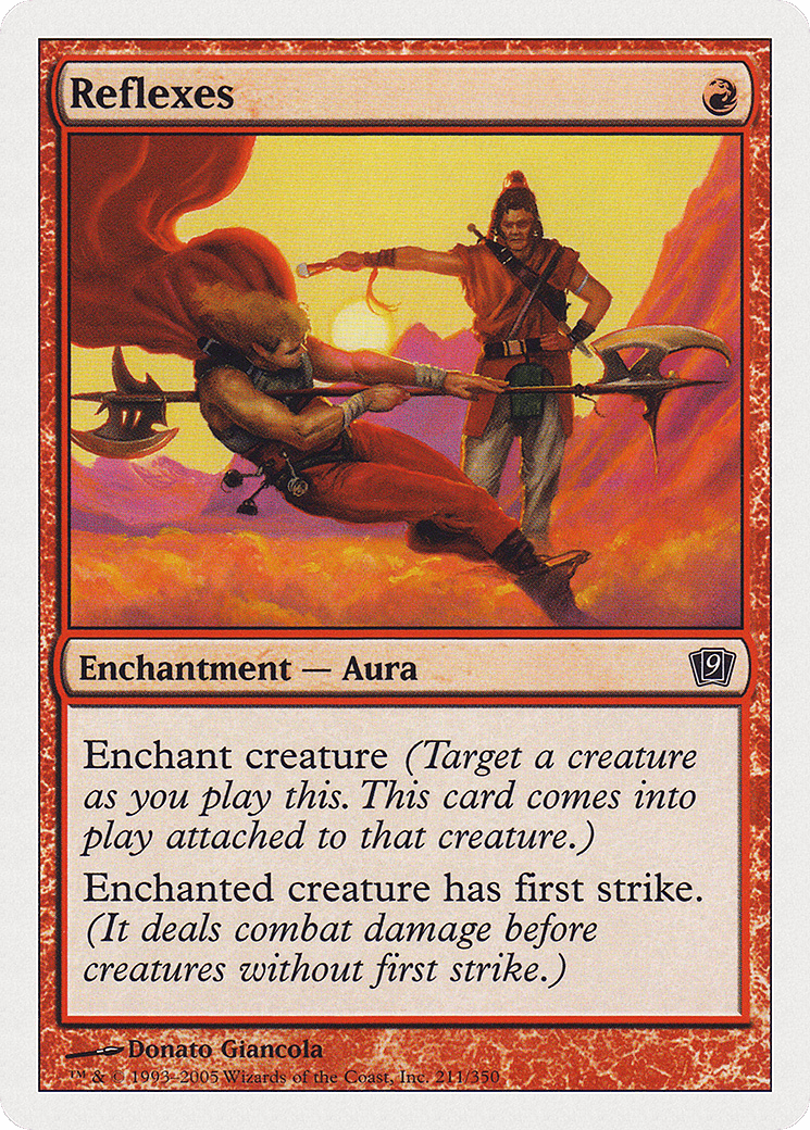 Enchanted creature has first strike. (It deals combat damage before creatures without first strike.)