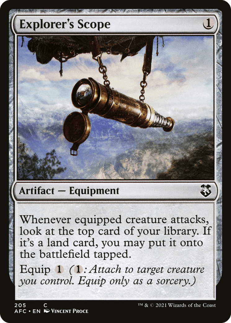 Whenever equipped creature attacks, look at the top card of your library. If it’s a land card, you may put it onto the battlefield tapped.