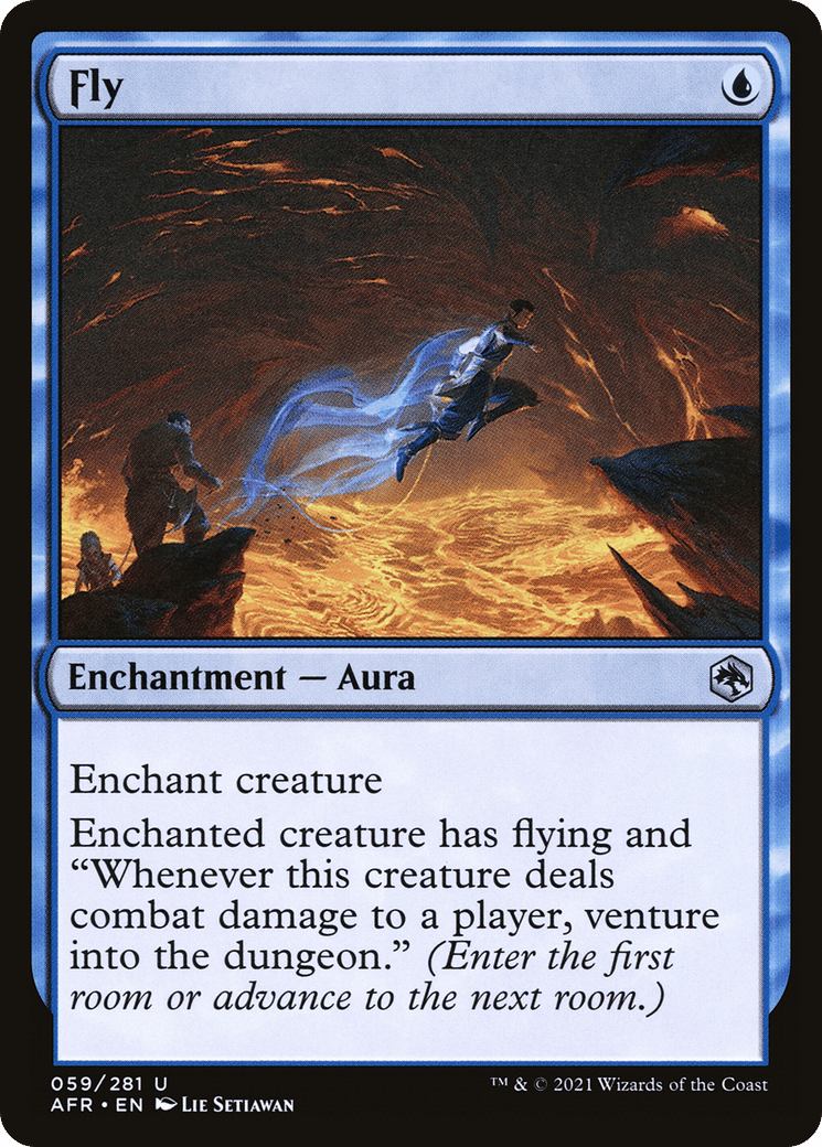 Enchanted creature has flying and “Whenever this creature deals combat damage to a player, venture into the dungeon.” (Enter the first room or advance to the next room.)