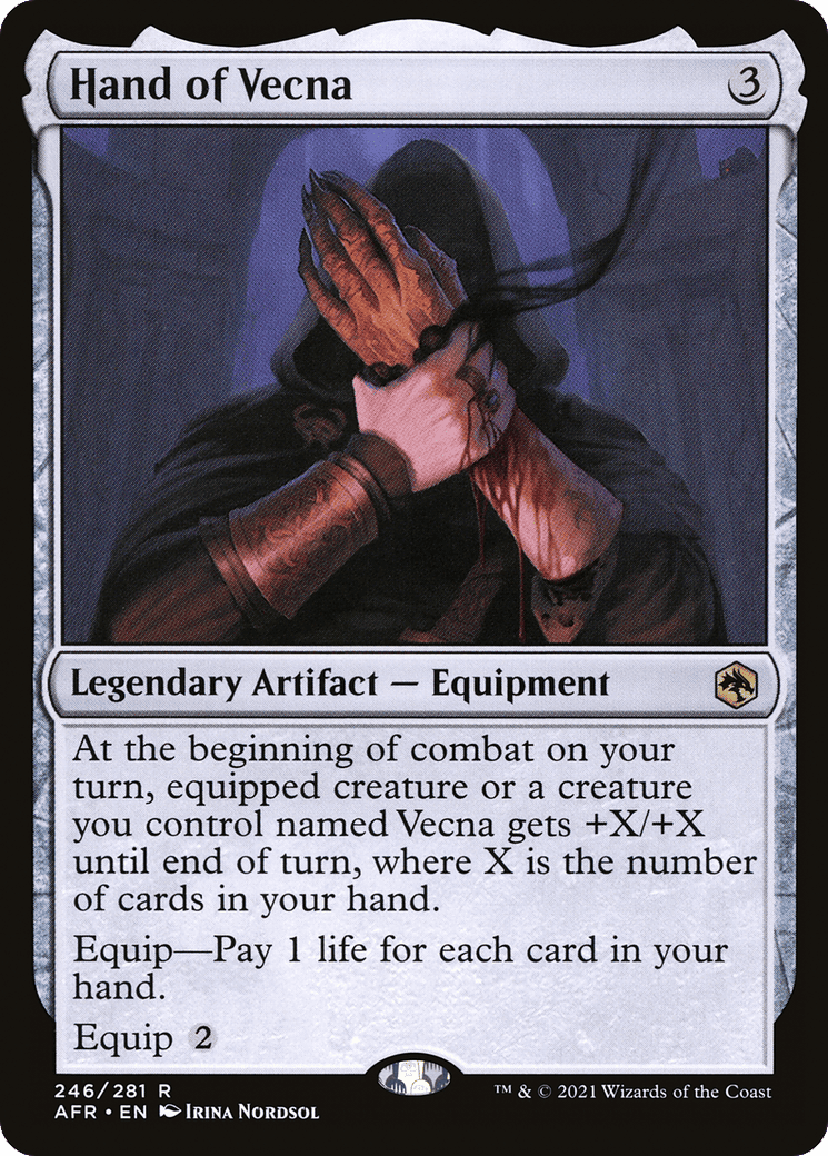 At the beginning of combat on your turn, equipped creature or a creature you control named Vecna gets +X/+X until end of turn, where X is the number of cards in your hand.