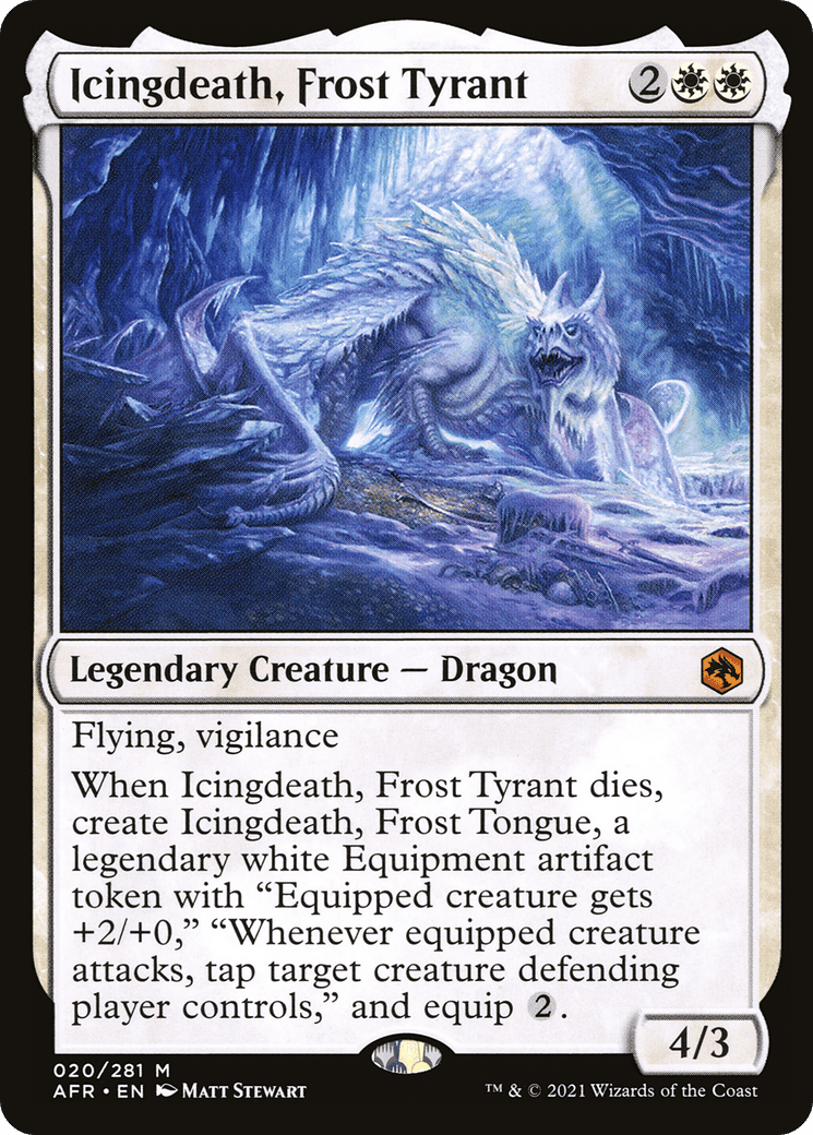 When Icingdeath, Frost Tyrant dies, create Icingdeath, Frost Tongue, a legendary white Equipment artifact token with “Equipped creature gets +2/+0,” “Whenever equipped creature attacks, tap target creature defending player controls,” and
