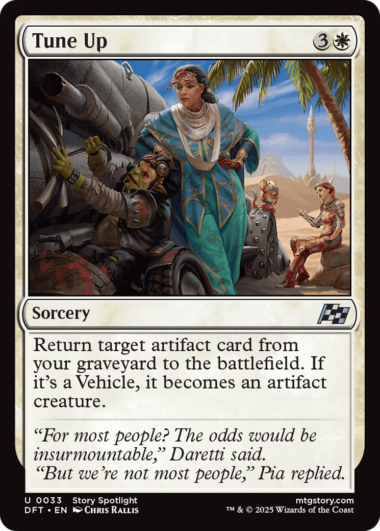 Return target artifact card from your graveyard to the battlefield. If it’s a Vehicle, it becomes an artifact creature.