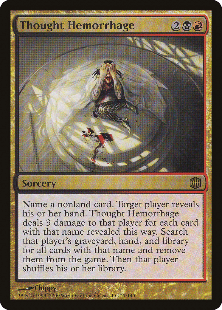 Choose a nonland card name. Target player reveals their hand. Thought Hemorrhage deals 3 damage to that player for each card with the chosen name revealed this way. Search that player’s graveyard, hand, and library for all cards with that name and exile t