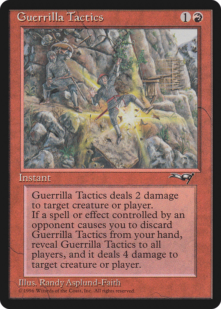 Guerrilla Tactics deals 2 damage to any target. When a spell or ability an opponent controls causes you to discard this card, it deals 4 damage to any target.
