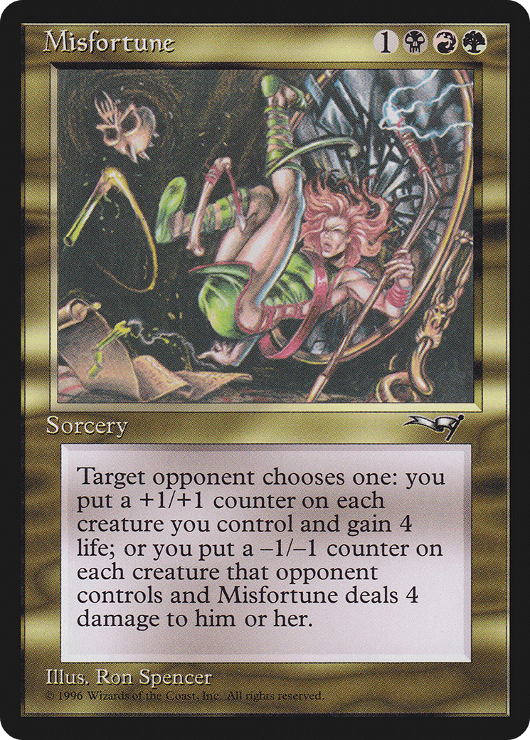 – You put a -1/-1 counter on each creature that player controls and Misfortune deals 4 damage to that player.