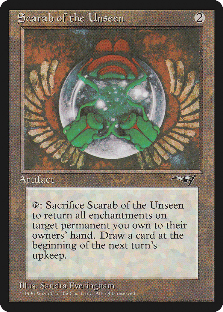 {T}, Sacrifice this artifact: Return all Auras attached to target permanent you own to their owners’ hands. Draw a card at the beginning of the next turn’s upkeep.