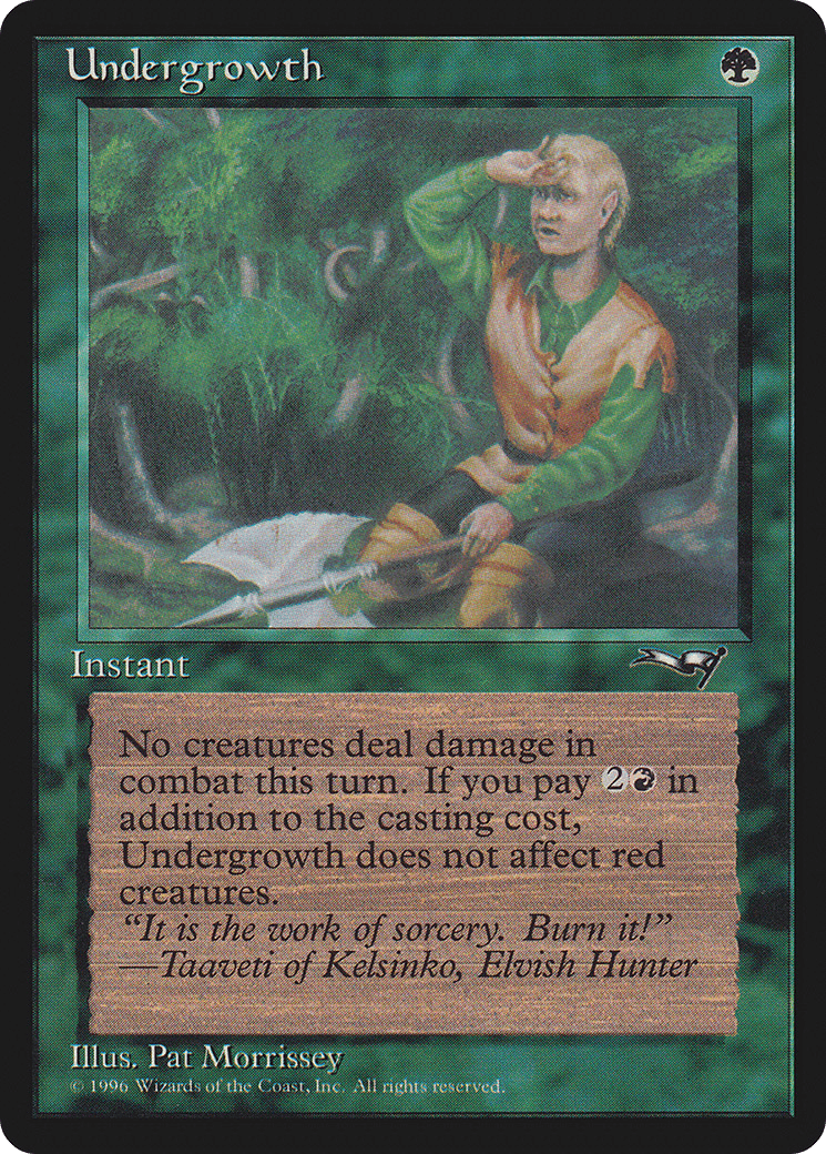 Prevent all combat damage that would be dealt this turn. If this spell’s additional cost was paid, this effect doesn’t affect combat damage that would be dealt by red creatures.