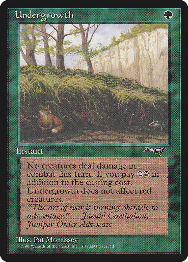 Prevent all combat damage that would be dealt this turn. If this spell’s additional cost was paid, this effect doesn’t affect combat damage that would be dealt by red creatures.