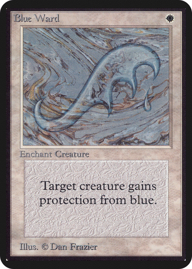 Enchant creature Enchanted creature has protection from blue. This effect doesn’t remove this Aura.