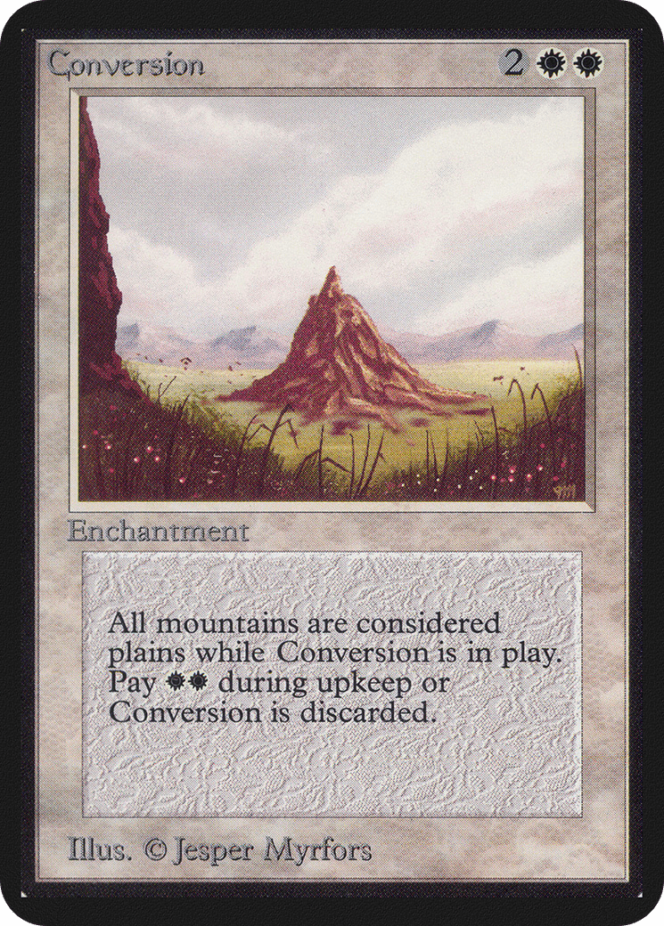 At the beginning of your upkeep, sacrifice this enchantment unless you pay {W}{W}. All Mountains are Plains.