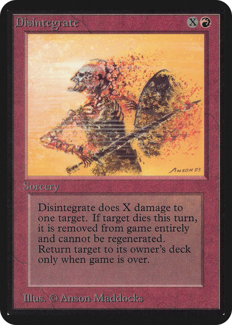 Disintegrate deals X damage to any target. If it’s a creature, it can’t be regenerated this turn, and if it would die this turn, exile it instead.