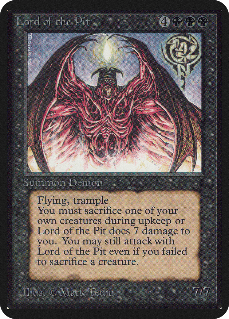Flying, trample At the beginning of your upkeep, sacrifice a creature other than this creature. If you can’t, this creature deals 7 damage to you.