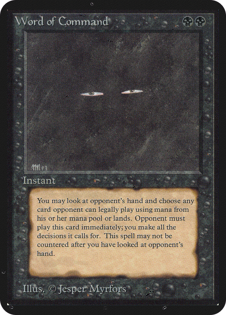 Look at target opponent’s hand and choose a card from it. You control that player until Word of Command finishes resolving. The player plays that card if able. While doing so, the player can activate mana abilities only if they’re from lands that player c