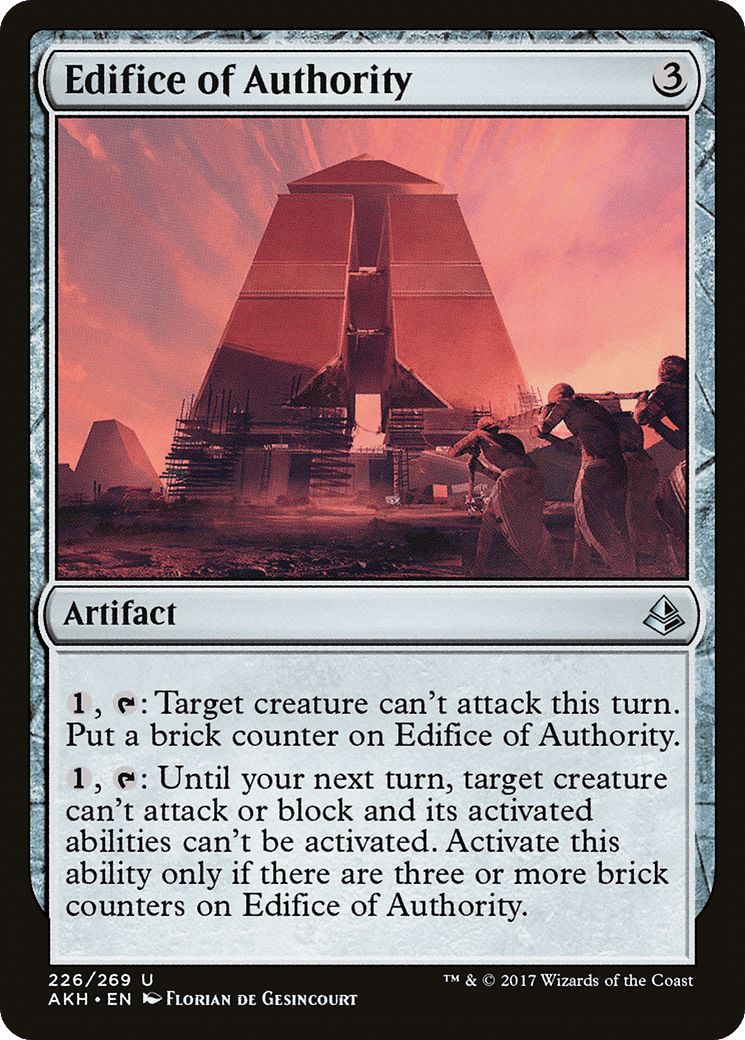 {1}, {T}: Target creature can’t attack this turn. Put a brick counter on this artifact.