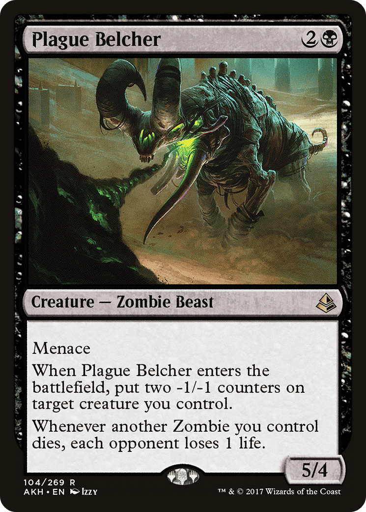 Menace When this creature enters, put two -1/-1 counters on target creature you control. Whenever another Zombie you control dies, each opponent loses 1 life.