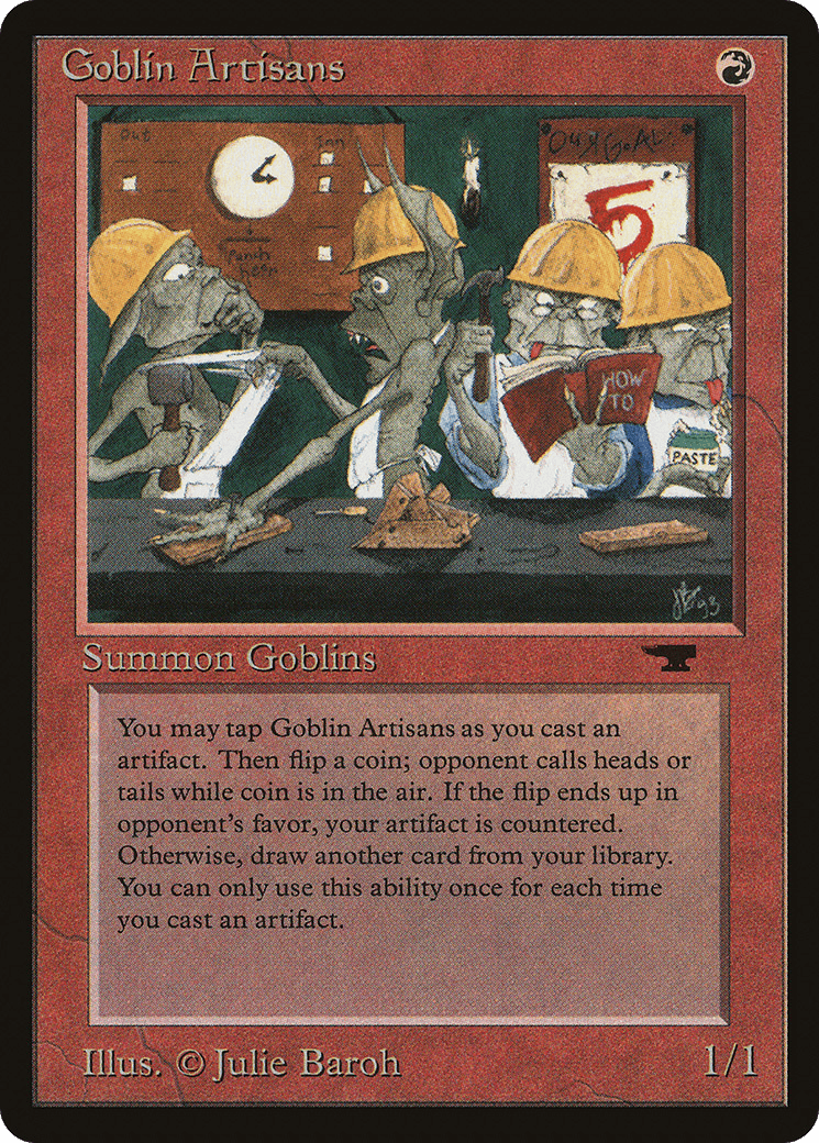 {T}: Flip a coin. If you win the flip, draw a card. If you lose the flip, counter target artifact spell you control that isn’t the target of an ability from another creature named Goblin Artisans.