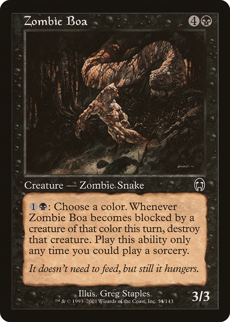 {1}{B}: Choose a color. Whenever this creature becomes blocked by a creature of that color this turn, destroy that creature. Activate only as a sorcery.