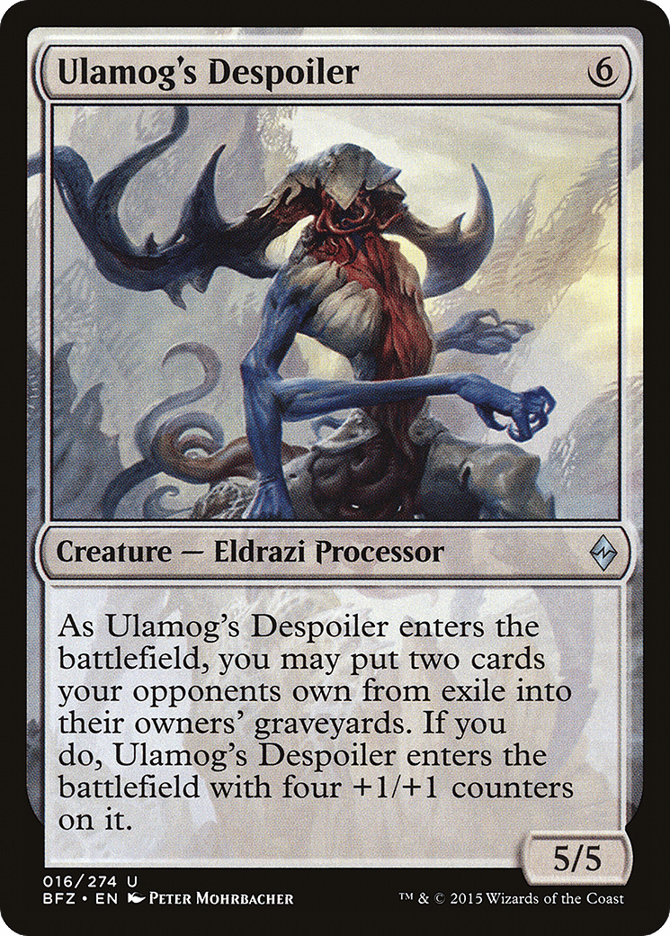 As this creature enters, you may put two cards your opponents own from exile into their owners’ graveyards. If you do, this creature enters with four +1/+1 counters on it.