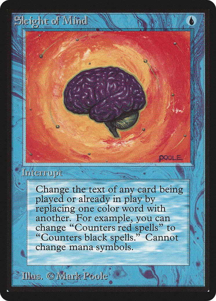 Change the text of target spell or permanent by replacing all instances of one color word with another. (For example, you may change “target black spell” to “target blue spell.” This effect lasts indefinitely.)