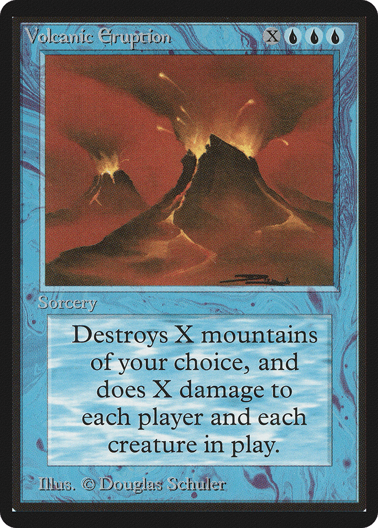 Destroy X target Mountains. Volcanic Eruption deals damage to each creature and each player equal to the number of Mountains put into a graveyard this way.